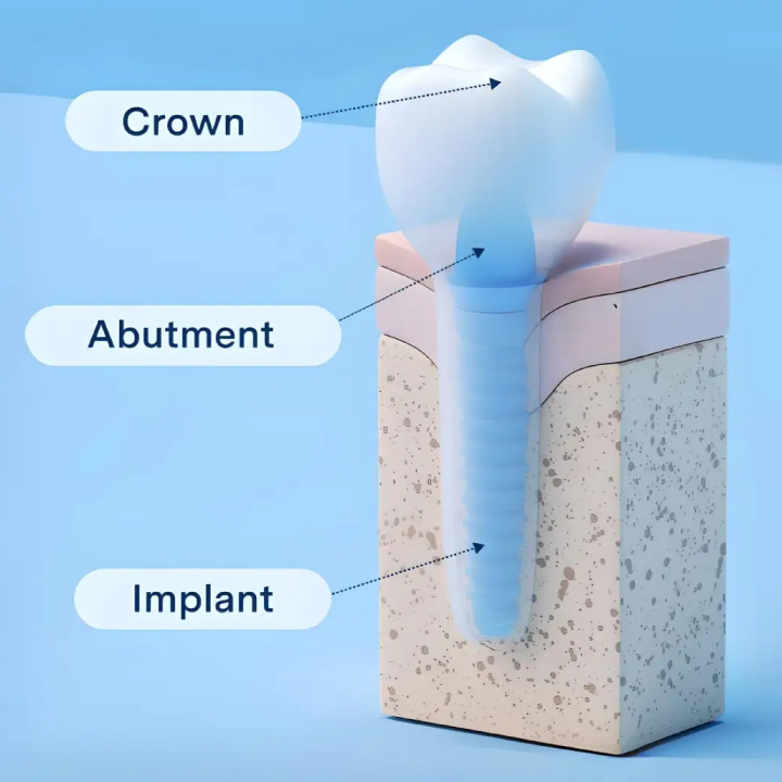 Crown: This is the part of the tooth that you can see. It’s usually made of zirconium or porcelain for durability and good looks.